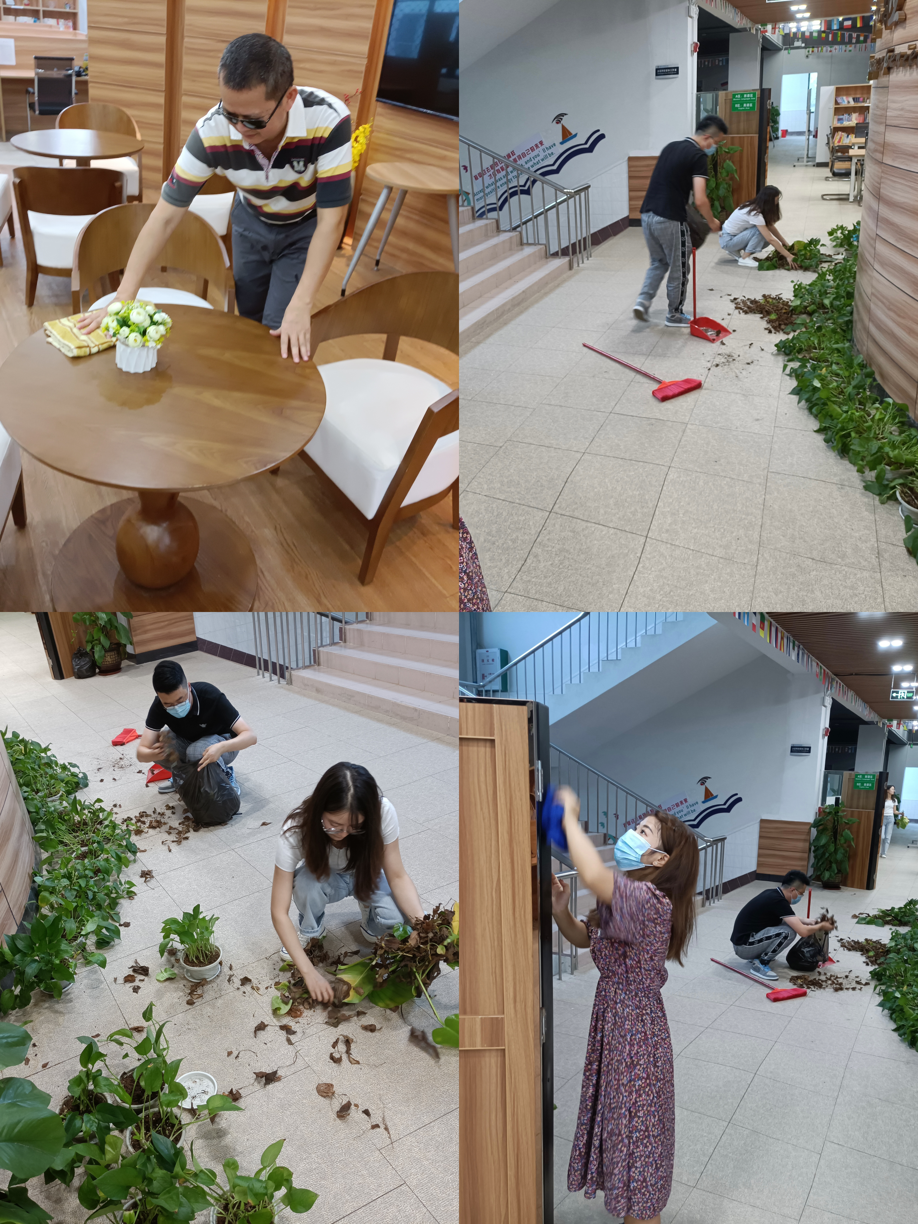 陈建奇副主任首先带领大家来到国际语言体验中心,给大家分配好任务和清洁工作。接下来,大家齐心协力进行大扫除。活动中,部门成员以饱满的激情投入到打扫中去,发挥不怕脏、不怕累精神,拿着抹布、扫帚、簸箕、垃圾袋等工具对体验中心区域内的地面、卫生死角、桌面等进行全面的垃圾清扫。经过一下午的清理,垃圾全部被清理干净,为迎接师生的到来做好了充分的准备。