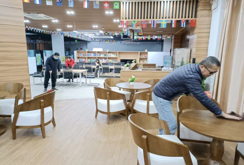 2月24上午,为迎接新学期到来,落实防疫政策,国际交流中心(东盟研究中心)全体人员在外事科科长陈建奇的带领下,共同对我部门所负责的综合楼BE503教室、语言体验中心、部门办公室进行卫生清洁工作。同时落实相关安全工作,解决好外教宿舍、教室设备等现存问题,继续排查我中心各类安全隐患,及时上报问题并解决。