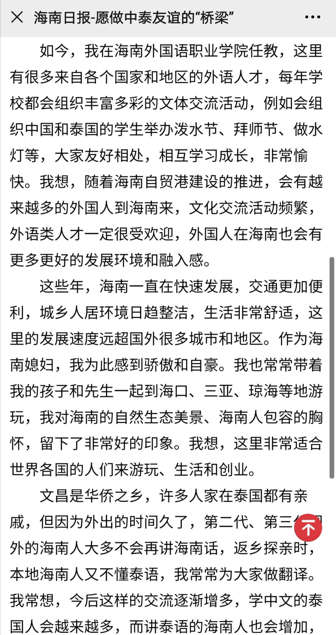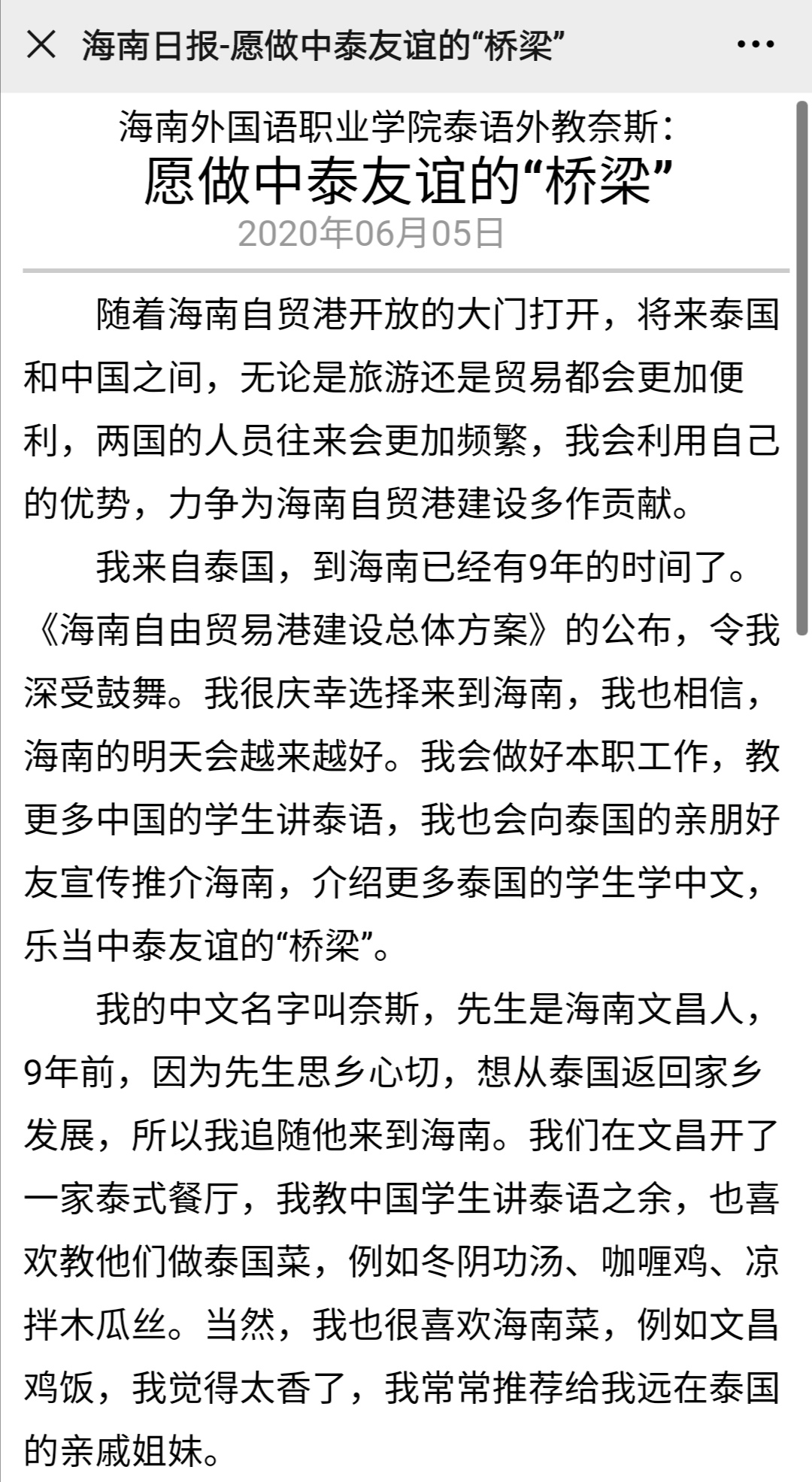 2020年6月3日,海南日报对我院泰语外教奈斯进行采访。奈斯是泰国人,在海南生活了9年,在我院担任泰语外教已有5年,工作认真负责,深受学生喜爱。奈斯老师表示,在做好本职工作的同时,会积极向泰国推介海南,乐当中泰友谊的桥梁。以下是海南日报关于泰语外教奈斯的采访: