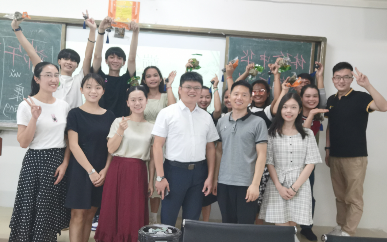 6月24日下午,国际交流中心(东盟研究中心)对外汉语教研室举办端午节专题文化交流活动,与在校国际学生一起欢度端午佳节。同时,此次文化交流活动还在抖音APP上进行了直播,方便由于疫情原因本学期一直无法回中国继续上课的国际生观看。线上线下,国际交流中心主任饶其康、国际学生辅导员潘立鹏及对外汉语教研室全体教师、实习辅导员程建阳、全体国际学生一起“粽”情端午,尽情放“粽”。