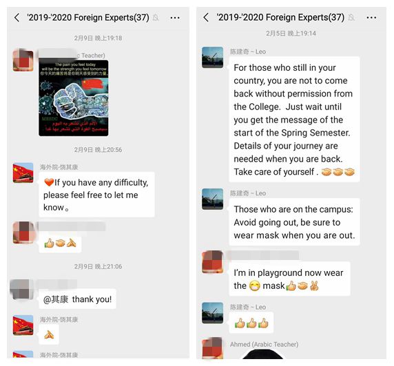 对于已经回国的外教,我中心联合外事秘书、外教助理向外教介绍中国的防疫情况、我省及我院的防疫相关规定,并保证每名外教都有专人对接,可以随时联络到人,为疫情过后平稳开学做好准备。