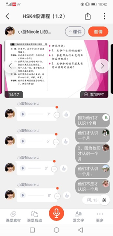 (4)问题:读写课程中的读,听说课中的说,需要示范、纠错与互动。荔枝微课目前的形式,仅能教师发语音,学生不能语音回复造成朗读不能及时反馈。
