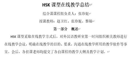 自2月17日起实施以来,在线教学整体情况良好。对外汉语教研室针对学历生和语言生开设汉语综合、汉语听说、HSK教程等共计12门线上教学课程,参与国际学生43人次。运用荔枝微课、中国大学慕课等多种线上教学平台实施线上教学。向分布在世界各地的国际学生传授汉语知识,传播中国文化,传递中国正能量。