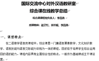 对外汉语教研室自2月17日开始线上教学工作,整体情况良好。针对学历生和语言生开设汉语综合、汉语听说、HSK教程等共计12门线上教学课程,参与国际学生43人次。运用荔枝微课、中国大学慕课等多种线上教学平台实施线上教学。向分布在世界各地的国际学生传授汉语知识,传播中国文化,传递中国正能量。