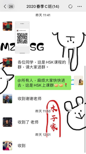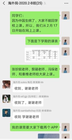 根据学生汉语水平分为ABCD四个班级进行授课。每个班级都建立的班级管理微信群,班主任在群里告知学生关于在线教学的事宜和要求,督促学生学习。每个任课老师又建立了课程学习微信群,在群中发布学习任务、电子教材、课件、学习资源、作业等,方便教学管理。