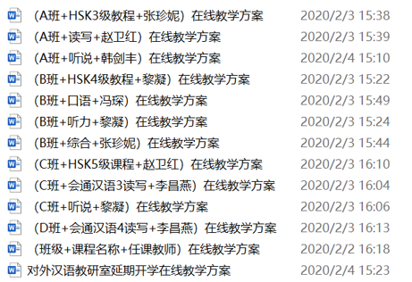 1月31日晚,在接到学院教务处发布的《关于延迟开学开展在线教学方案的通知》后,对外汉语教研室全体教师即刻思考针对国际学生的线上教学方式。面对国际学生的线上教学存在许多问题,一是现有的网络课程大多是针对国内学生设计的,极少有适合国际学生学习的网络课程资源;二是大多数在线教学平台,如云班课、智慧树等也是为国内学生设计的,对于汉语水平不高的国际学生来说操作困难;三是国际学生分布在世界各地,存在时差、上网条件差等问题。针对这些问题,教师们认真思考,展开讨论,热心分享,积极寻找解决办法。
