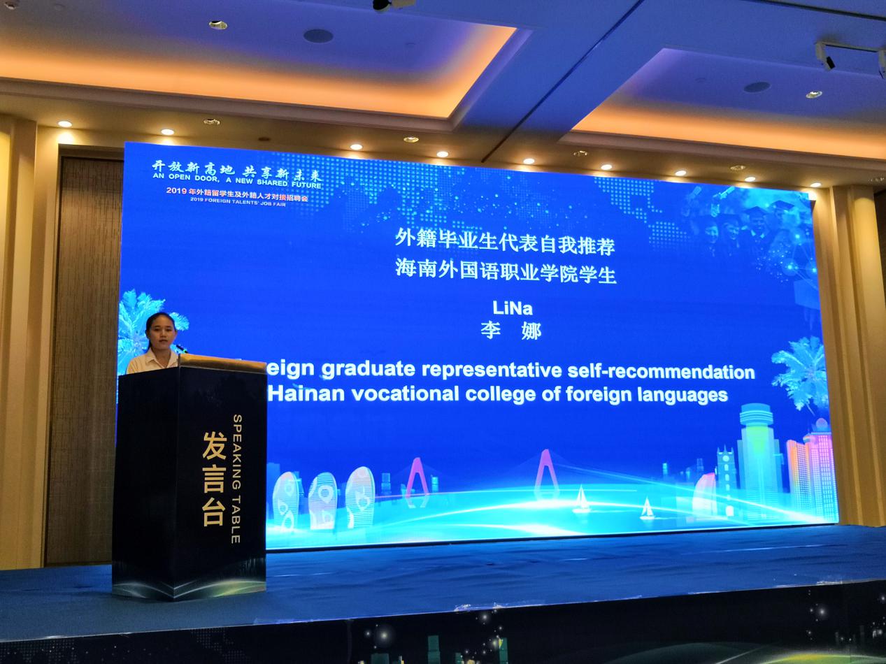 12月18日上午,2019年海南省首届外籍留学生及外籍人才对接招聘会在海口举行.我院优秀柬埔寨留学生李娜作为代表在会上发言。