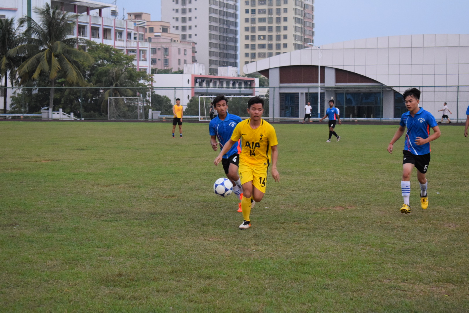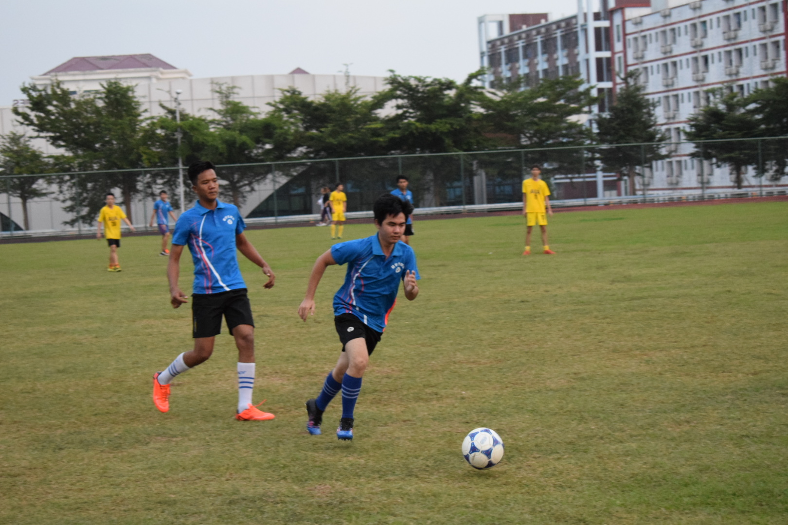 我院对这次比赛也十分重视,免费为留学生提供了球衣。图为身着蓝色球衣的柬埔寨留学生在带球。