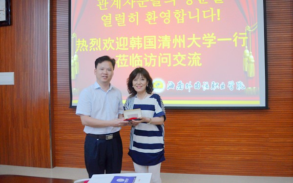 座谈中,杨学前副院长对清州大学客人的来访表示欢迎,并对我院从发展历史、办学特色、专业建设、办学成果等方面做了简要介绍,重点介绍了我院外语教学的优势和成果,指出希望借此次交流座谈为契机,打开双方合作局面。 陈祯美处长在发言时对我院的发展成绩表示赞赏。在介绍了清州大学的基本情况后,她表达了对与我院合作的期望和信心,希望此次来访,能够与我院建立合作,共同促进双方发展。 会上,双方与会人员还围绕教师互访、学生培养、科研项目合作等方面展开深入探讨和交流。会谈结束后,双方还互赠了礼物。 清州大学创建于1946年11月,目前该校有在校生12000多名,60多个专业,产业设计、太阳光专业位居韩国第一,电影专业排名韩国第三。清州大学是一所全球化的大学,有来自20个国家500多名留学生就读于该校,现在该校已与世界160多所大学签署了友好合作协议,并与88所中国大学签署了友好合作协议,目前有3600名中国留学生毕业于该校。