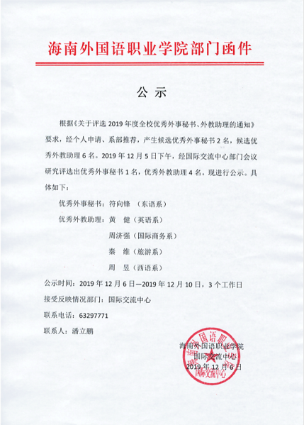 2019年度全校优秀外事秘书、外教助理评选结果公示
