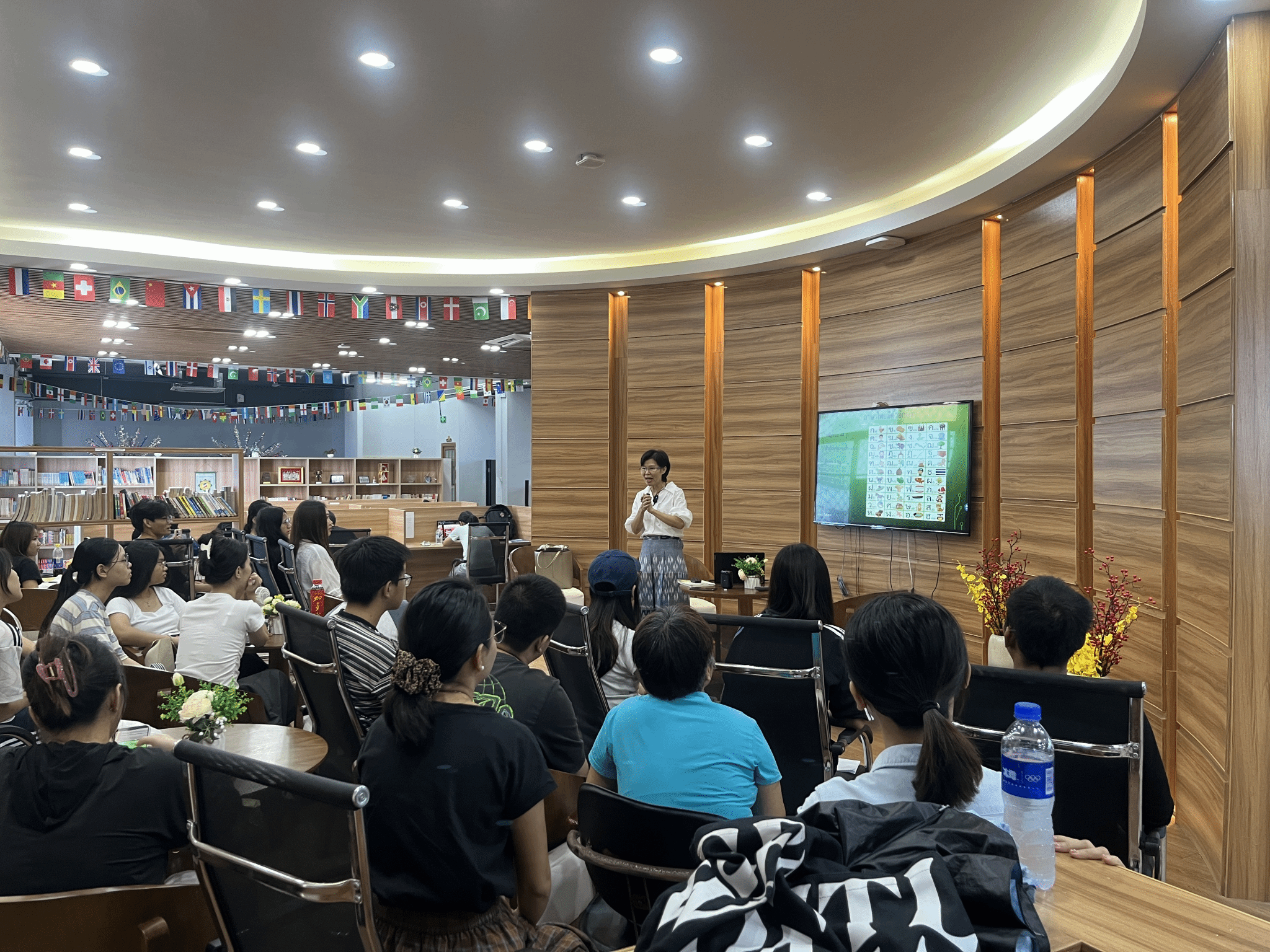 不仅如此,奈斯老师还介绍了中国的艺术文化在泰国寺庙建筑、壁画风格中的融合发展。她娓娓道来,让师生们深刻感受到语言交流背后所蕴含的文化交融,以及中泰两国文化之间那份难以割舍的渊源。