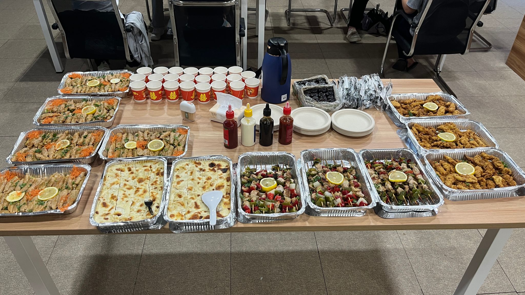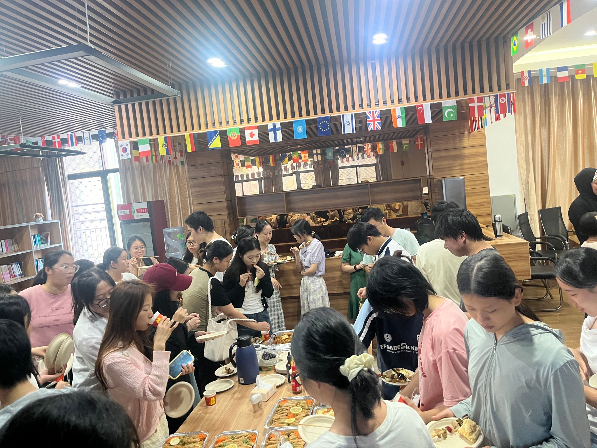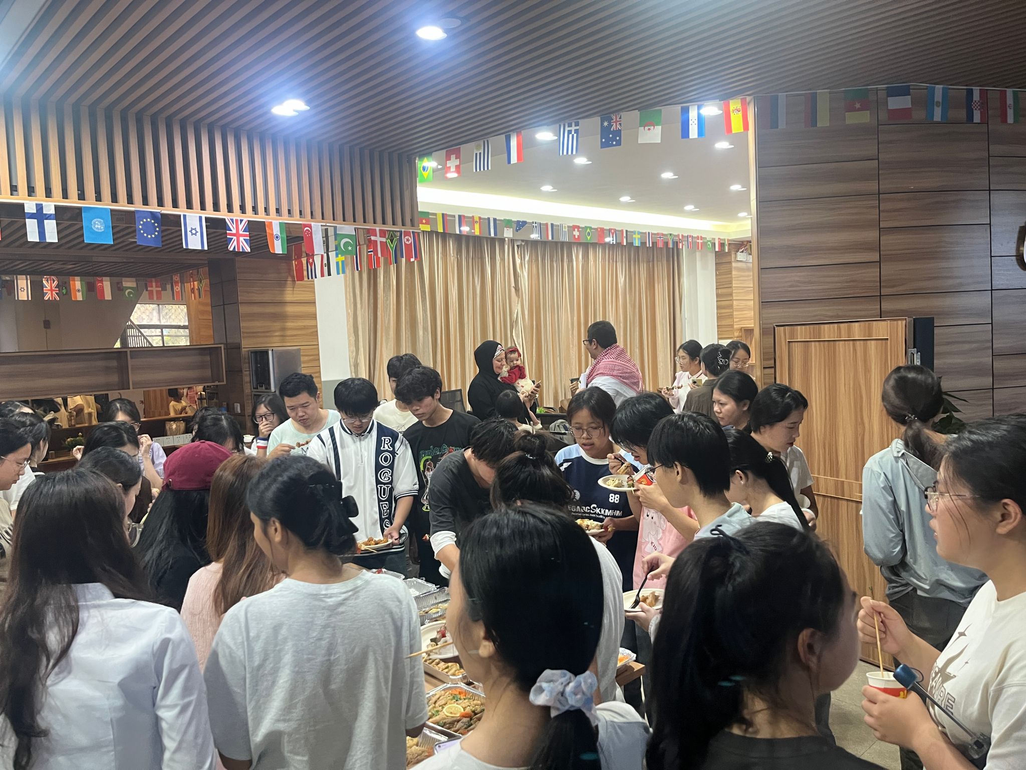 活动现场还提供了品尝阿拉伯传统美食的环节,艾哈迈德老师请大家品尝了由他夫人制作的几种阿拉伯传统美食,包括烤肉串、炸鸡块、葡萄叶卷、椰枣等。当师生们品尝了美味的食物后便深深被阿拉伯美食文化所吸引,纷纷称赞食物的美味与独特,并与艾哈迈德老师探讨起中阿美食的异同,进一步激发了他们探索和学习不同国家文化的浓厚兴趣。他们期待着未来能更多地参与文化沙龙活动,在多元文化的海洋中遨游,感受不同语言文化的独特魅力。