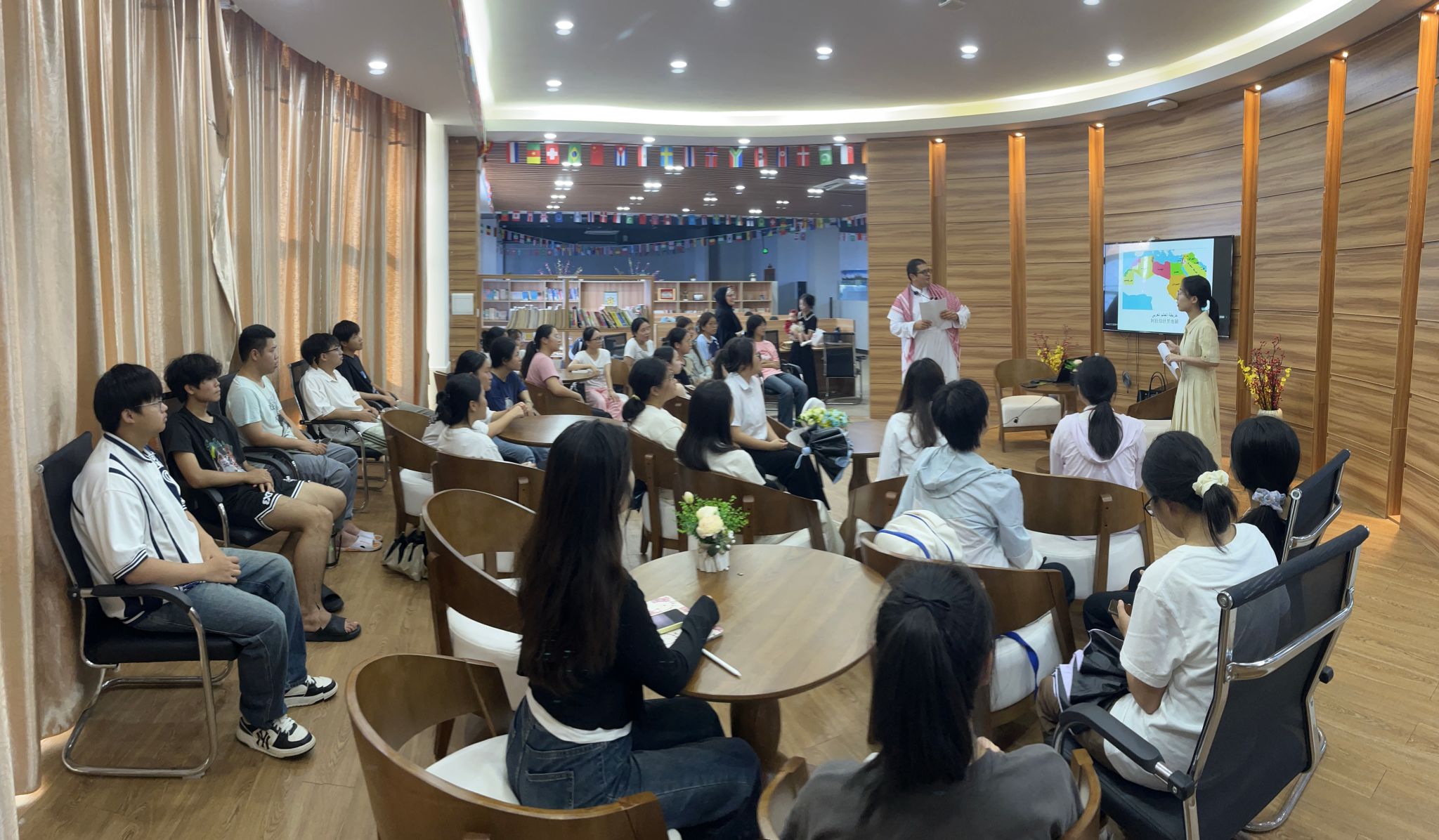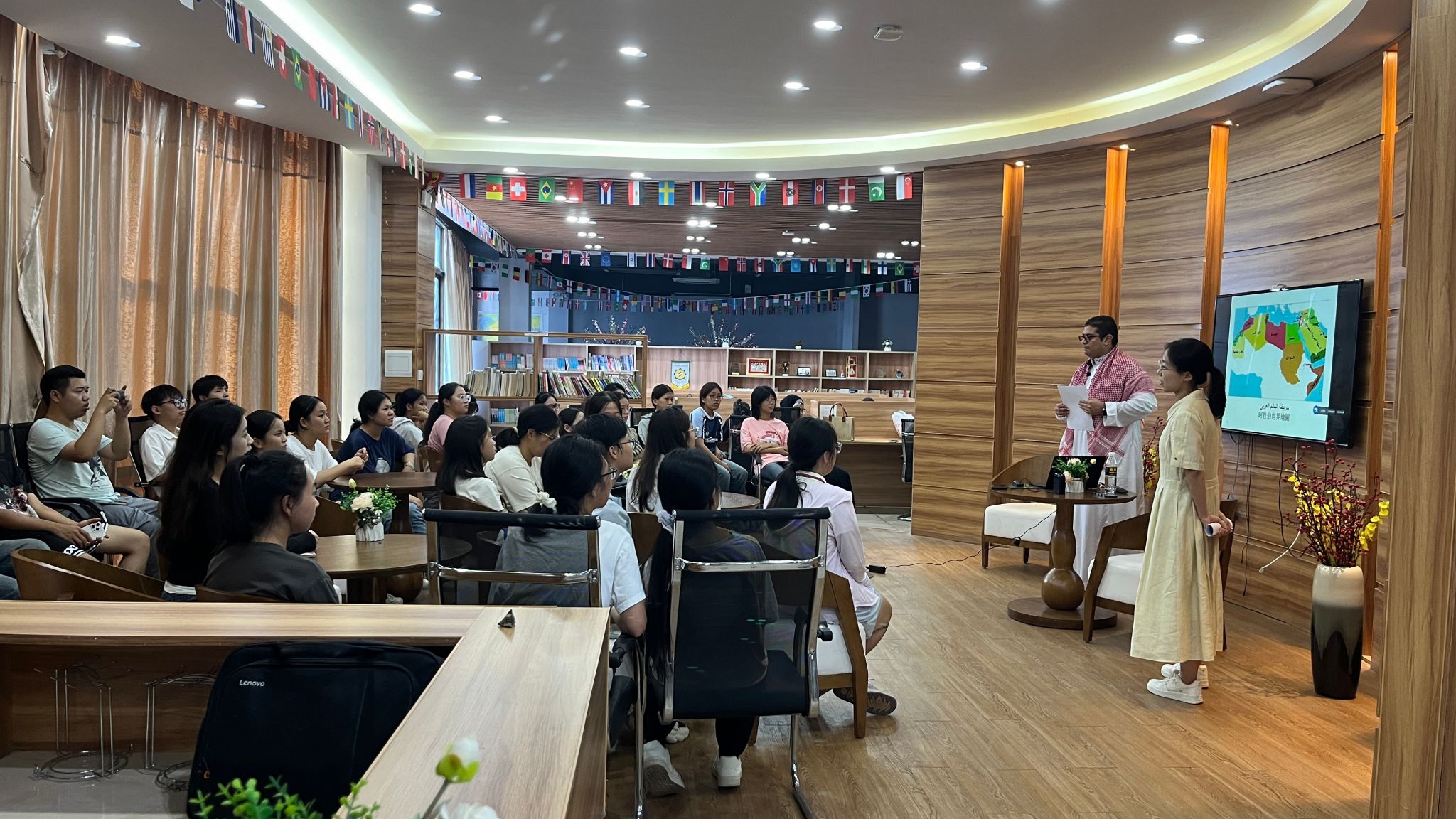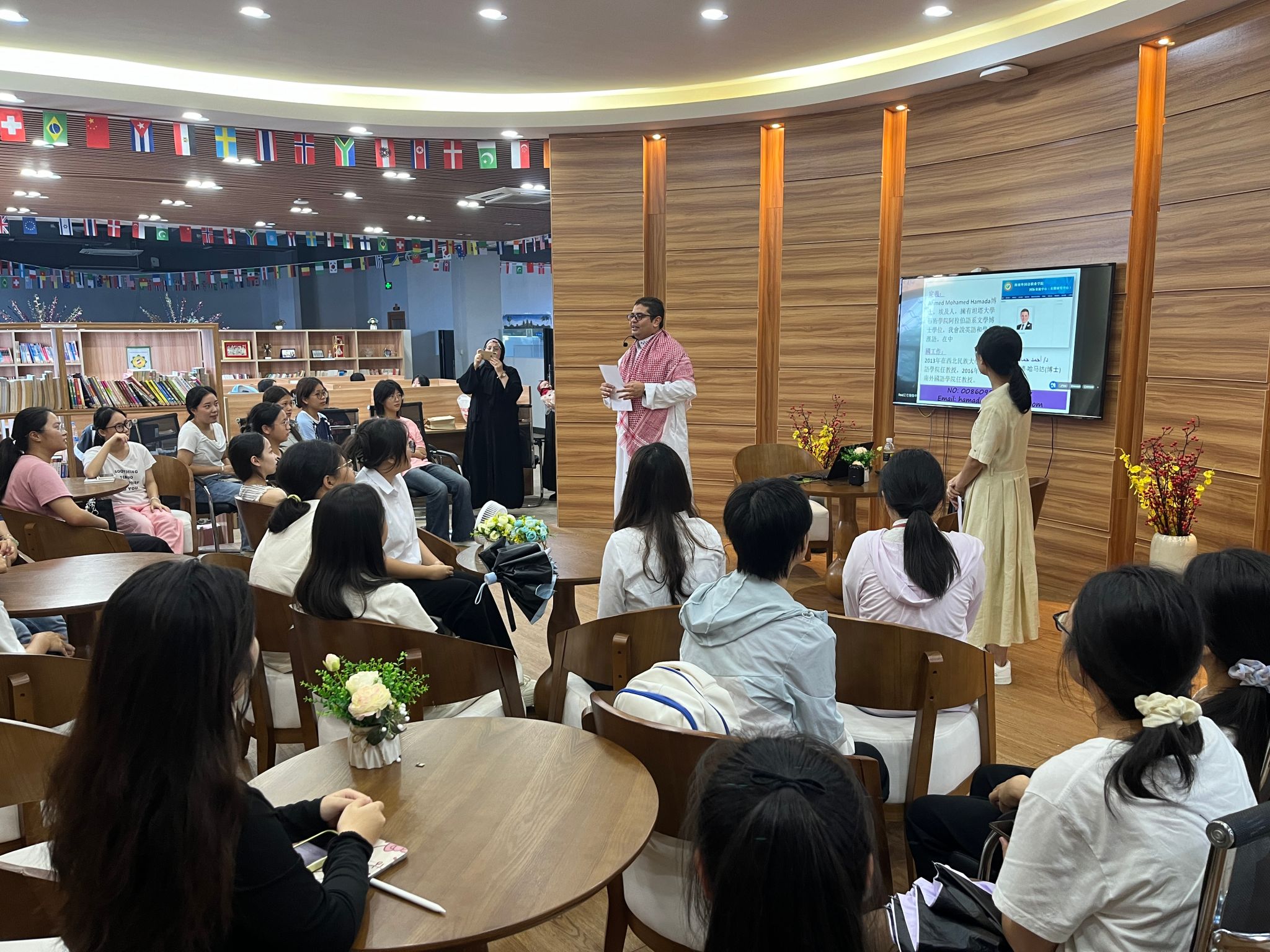 在讲座中,艾哈迈德老师身着阿拉伯传统服饰,以阿拉伯国家概况、地理位置为切入点,带领同学们了解了阿拉伯国家的整体情况,接着强调了阿拉伯语作为联合国官方语言和22个阿拉伯国家的通用语言的重要性以及使用的广泛性。随后对中国和阿拉伯国家之间源远流长的友好往来历史进行了介绍,无论是官方使团的派遣,还是民间自发的旅程,都见证了中阿文明之间的沟通与融合。