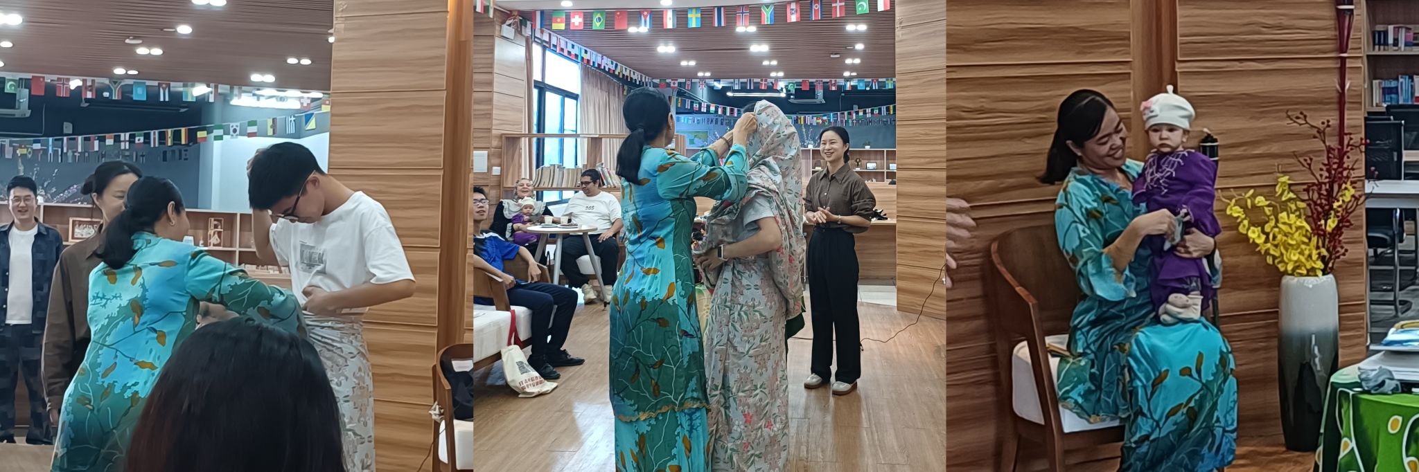 最后笛安老师再次邀请了两位同学上台,这次是要示范马来西亚传统服饰——龙纱裙的穿着方式。龙纱裙是马来西亚许多庆典和特殊场合的首选服饰。笛安老师先是展示了如何将龙纱裙轻轻展开,然后耐心地指导同学们如何正确地系上腰带,调整裙摆,使其自然垂落,每一步都透露着对服饰的尊重与热爱。值得一提的是艾哈迈德博士一家也来了,他们的小女儿作为本次活动的小嘉宾,为同学们展示了马来西亚小宝宝所穿的传统服饰。