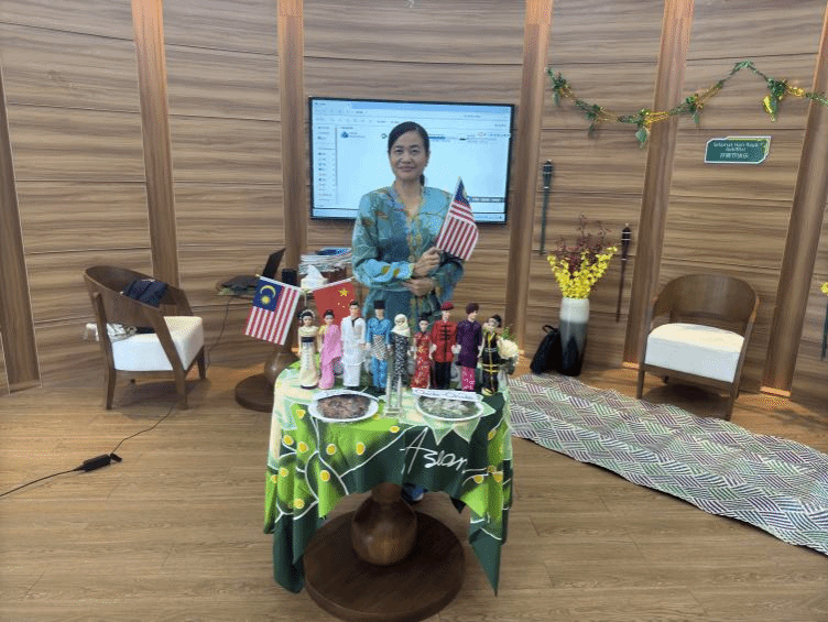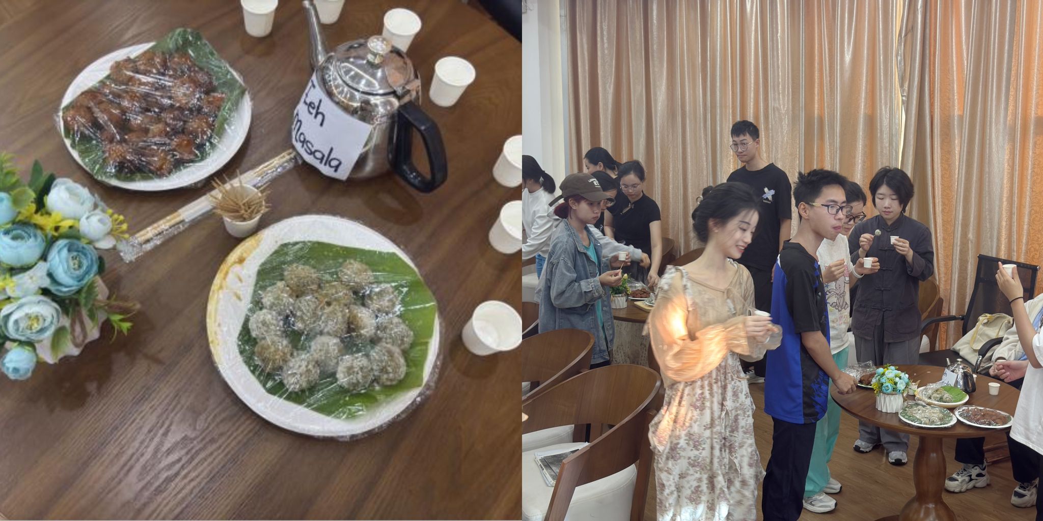 活动尚未正式开始,现场已弥漫着浓郁的马来西亚风情。笛安老师不仅精心准备了各式各样的马来西亚特色美食,有香浓的拉茶、清甜的椰香糯米球、酥脆的炸香蕉球,她还细心地布置了开斋节的现场,彩带鲜花,营造出一种温馨的节日氛围。现场还摆放着几个穿着马来西亚民族服饰的精致娃娃,它们身着色彩斑斓的传统服装,栩栩如生,仿佛也在欢迎每一位来宾的到来,使得整个场景更加生动且富有文化气息。