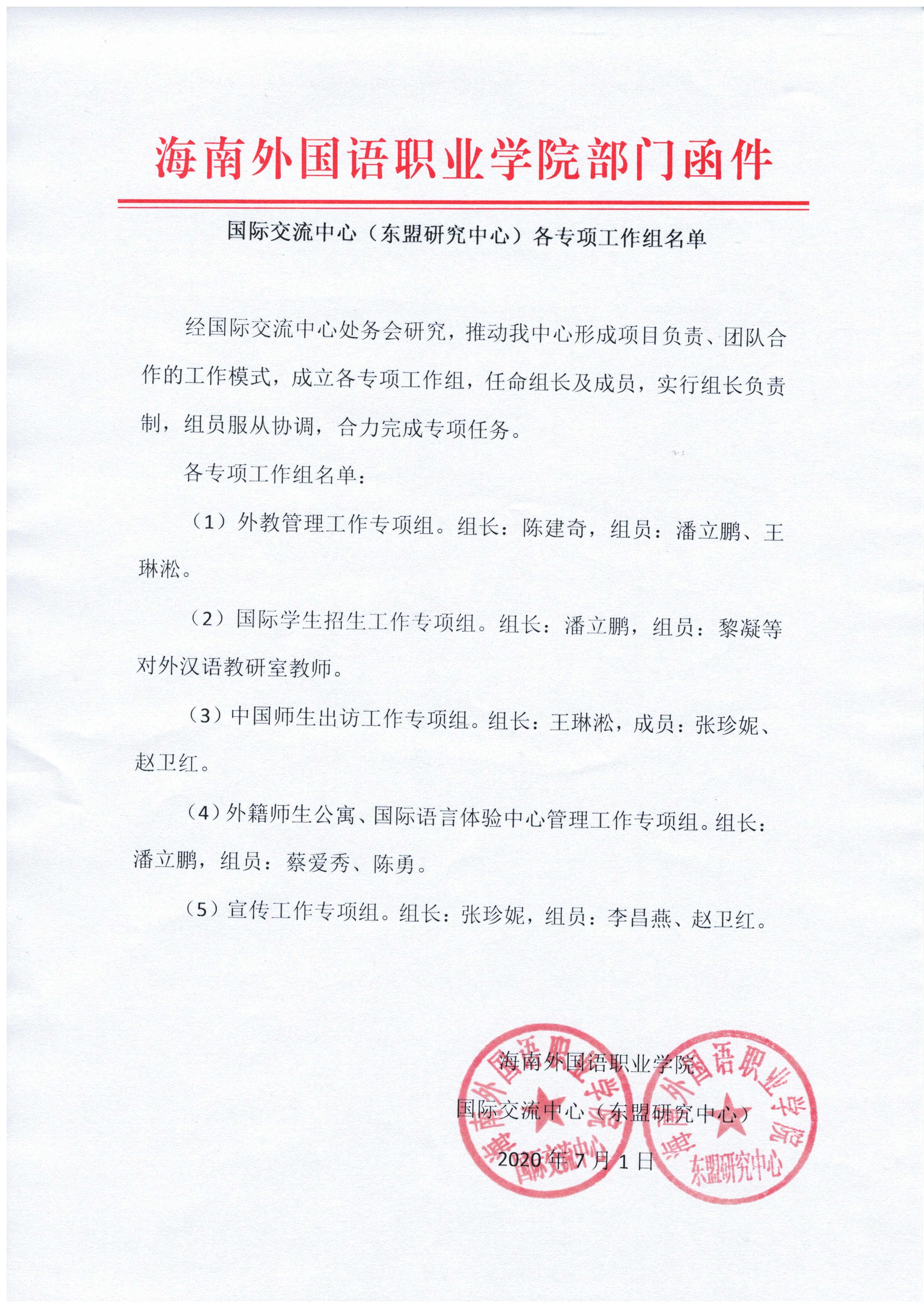 经国际交流中心处务会研究,推动我中心形成项目负责、团队合作的工作模式,成立各专项工作组,任命组长及成员,实行组长负责制,组员服从协调,合力完成专项任务。 各专项工作组名单: (1)外教管理工作专项组。组长:陈建奇,组员:潘立鹏、王琳淞。 (2)国际学生招生工作专项组。组长:潘立鹏,组员:黎凝等对外汉语教研室教师。 (3)中国师生出访工作专项组。组长:王琳淞,成员:张珍妮、赵卫红。 (4)外籍师生公寓、国际语言体验中心管理工作专项组。组长:潘立鹏,组员:蔡爱秀、陈勇。 (5)宣传工作专项组。组长:张珍妮,组员:李昌燕、赵卫红。 开云kaiyun登录入口 国际交流中心(东盟研究中心) 2020年7月1日