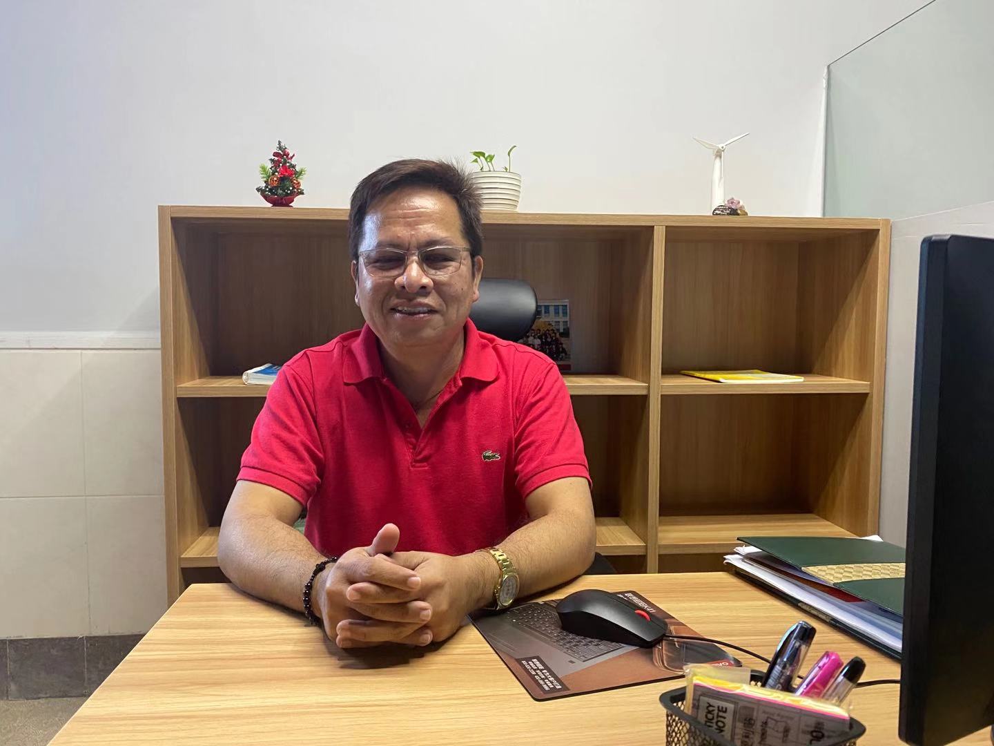 Felimon JR.negre是来自菲律宾的英语外教,中文名字费利蒙,在我院从事英语教学。授课班级有10个。 费利蒙2017年第一次来中国上海,当时妻子在上海工作。此前费利蒙在菲律宾的银行工作了25年。经妻子建议,费利蒙回国后考取了对外英语教学的证书,然后来到海南文昌我院上班。 说起英语教学,费利蒙非常喜欢教师这个职业。学生的年纪和他的儿子年纪相仿,这让他在教学中对学生倍加爱护。而且和年轻的学生在一起,自己感到也随着年轻了很多。 费利蒙的汉语不是很好,但他喜欢汉语,想努力学习汉语。有时间会和学生请教或去中文老师的课堂学习。 生活上,费利蒙非常喜欢海南的天气,大体上和菲律宾的气候很相似。饮食整体也很棒,不同的是,中国的饮食偏油腻,这类食物让费利蒙不太能接受。说起对中国的印象,来到中国后感受最深的是,中国是一个非常自律、和平和安全的国家,这和他在来之前通过其他途径了解到的大相径庭。