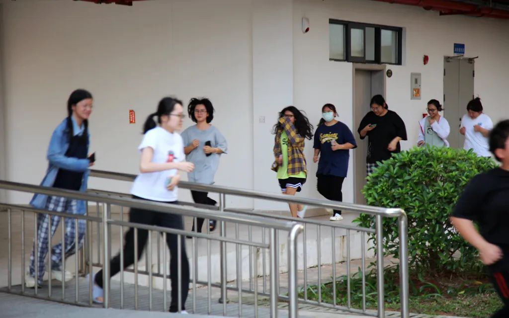 演练中,随着急促的警报声响起,参与演练的师生闻令而动,迅速进入了应急状态,精确、有序、安全地按照原定路线撤离了火场,及时地到达了安全区域,圆满完成演练任务。