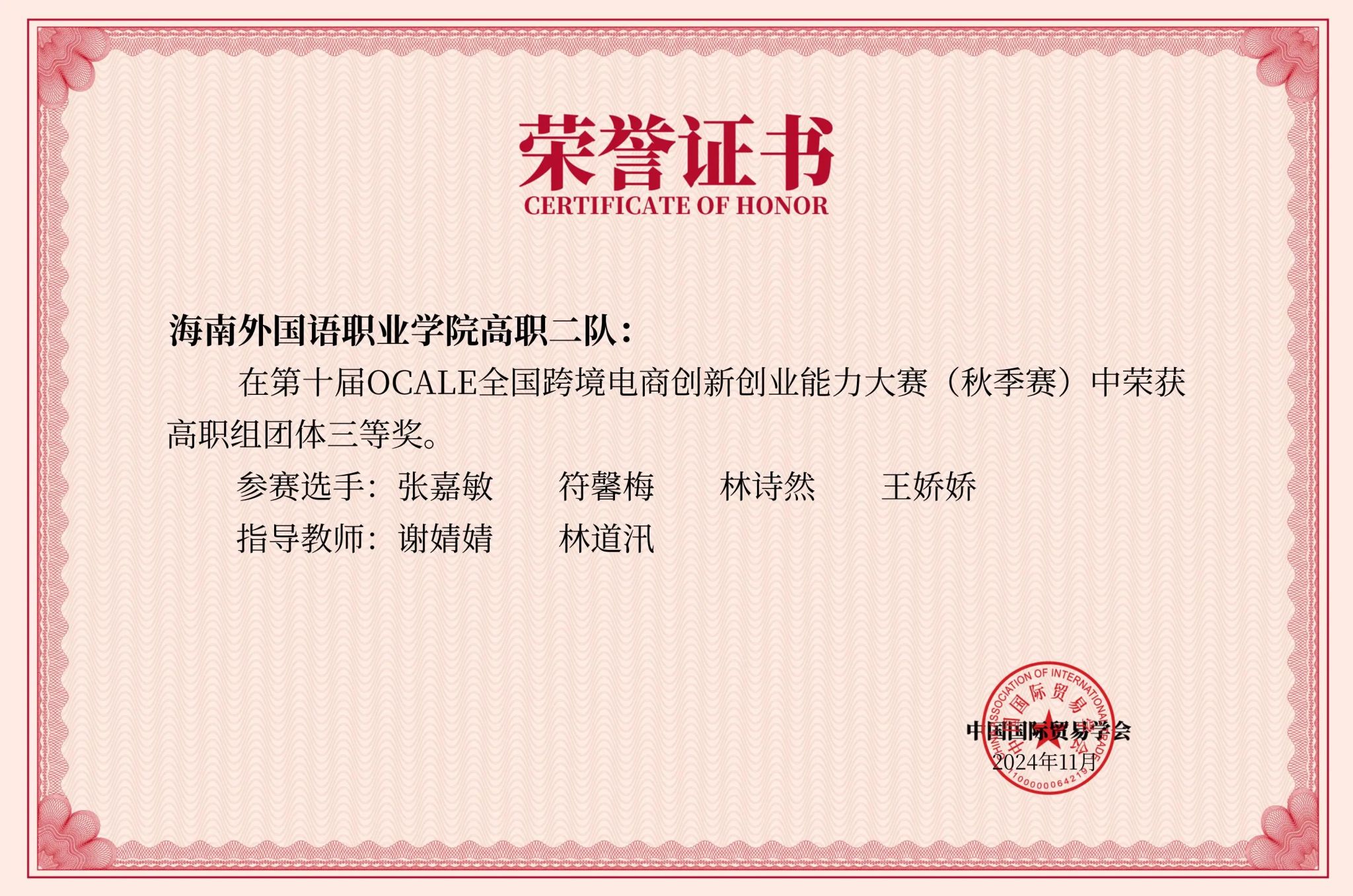 近日,由中国国际贸易学会举办的第十届OCALE全国跨境电商创新创业能力大赛(秋季赛)顺利结束。经过激烈角逐,开云官网国际商务学院冯怡、刘虹余、周汝欣、王子涵同学团队,潘金菊、王晓凤、王琼南、刘靖雯同学团队以及陈嘉腾、游家好、汤凯翔、梁川同学团队3支队伍在大赛中表现优异,分别斩获全国特等奖;王娇娇、符馨梅、林诗然、张嘉敏同学团队获得全国三等奖。谢婧婧、林梅、林道汛老师分别获优秀指导老师特等奖。