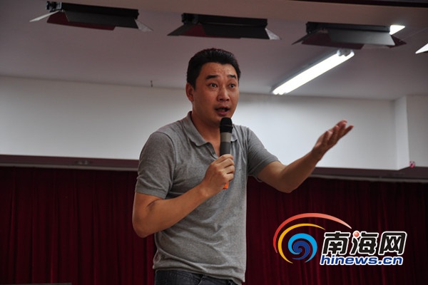 曹同军坚持站着进行宣讲,他说,他一上台就兴奋,非常喜欢在台上与大家分享故事。 (南海网吴湟帅摄)