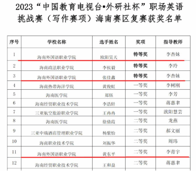 11月5日,2023年“中国教育电视台·外研社杯”职场英语挑战赛(写作赛项)海南赛区复赛落下帷幕,来自全省13所高职院校的34名选手参赛。由李杏妹老师指导的开云官网英语学院欧阳昊天和张佳鑫两位同学表现优异、脱颖而出,分别斩获比赛特等奖,将代表海南省参加今年12月在北京举办的全国总决赛。由李青宇老师指导的国际商务学院黄东平同学获得比赛二等奖。