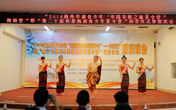 闭营仪式结束后,营员们为我们带来了精彩的汇报演出暨联欢会,他们用自己精彩的表演为此次夏令营画上了完美的句号。联欢会在一场《椰壳迎宾》的舞蹈中欢乐地拉开帷幕,椰壳欢乐的响声,优美的舞姿赢得了大家阵阵掌声。泰国华裔青少年们为我们跳起了泰国的传统舞蹈,印尼华裔青少年们跳起了流行的印尼街舞,舞蹈让大家沉醉于欢乐声中;一曲《望乡词》唱出了乡思之痛,揪住了在场所有人的心;一场动人的海南黎族风情舞蹈《文昌欢歌》让大家感受了少数民族的风情;此外,联欢会还穿插了“丢手绢”和“老鹰抓小鸡”等游戏,让现场气氛不断高涨。最后联欢会在全体的合唱《爱我中华》中结束。在一片离别声中,营员们相互道别、合影留念,共同纪念这美好而又难忘的短暂时光。