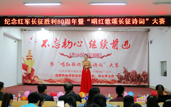 12月8日晚,由我院23年红旗不倒读书协会和时事协会联合主办的“不忘初心、继续前进”纪念红军长征胜利80周年暨唱红歌颂长征诗词大赛在图书馆多功能报告厅举行。社科部主要负责人周清云、关工委主任韩祝畴等有关部门负责人和广大师生一同观看了大赛。