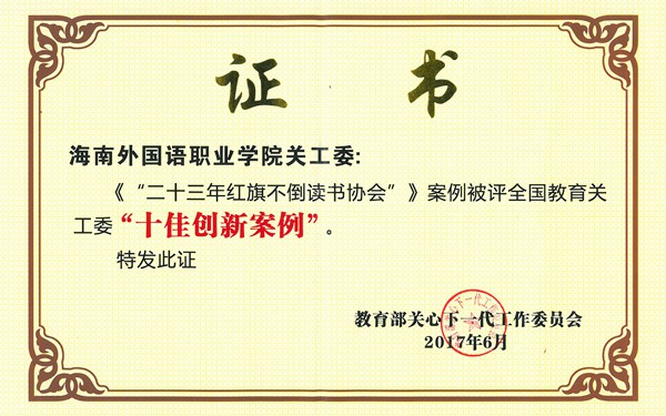 我院关工委上报的《二十三年红旗不倒读书协会》工作案例,凭着案例的特色和亮点,从全国各省市、部属高校推荐的300多个参评的创新案例中脱颖而出,晋级于全国30个优秀创新案例;经教育部、各省市、部直属高校关工委的专家和领导的严格评审,再次从30个优秀创新案例晋级前十,被评为全国教育关工委2017年“十佳创新工作案例”,受到教育部关工委的嘉奖。