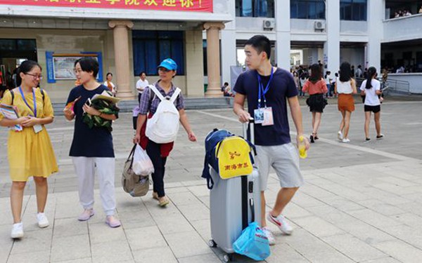 父母手中大大小小的行李,承载着满满的赤裸裸的爱与不舍,心中所想无法言语,眼神中流露出不舍与爱护,万千思绪交织在一起。可是,当学姐学长们接过新生们手中的行李,给以一个坚定的眼神,一个亲切的微笑,一句如海风般细腻的声音:“叔叔阿姨,我来提”,便化解了这些“新人”心中的不安,更让他们那颗躁动的心,平静了些许。