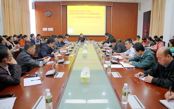 周灵均组长的报告以“坚定不移全面从严治党,率先夺取反腐败斗争压倒性胜利”为主题,结合党的十九大报告内容,对为什么要全面从严治党、为什么坚定不移全面从严治党、我省教育系统全面从严治党的现状,以及全面从严治党的新要求等问题进行一一解读。