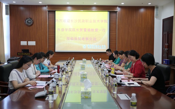 5月11日下午,长沙民政职业技术学院外语学院院长贺雪娟教授一行4人莅临我院访问交流。我院涉外职业教育研究中心研究员景志华,省应用英语日语研究会主任、我院特聘教授刘丽艳,教务处负责人吴慧华,英语系主要负责人张清萍等接待了来访者一行。双方于综合楼7楼第一会议室就少儿师资专业建设等话题开展座谈交流。
