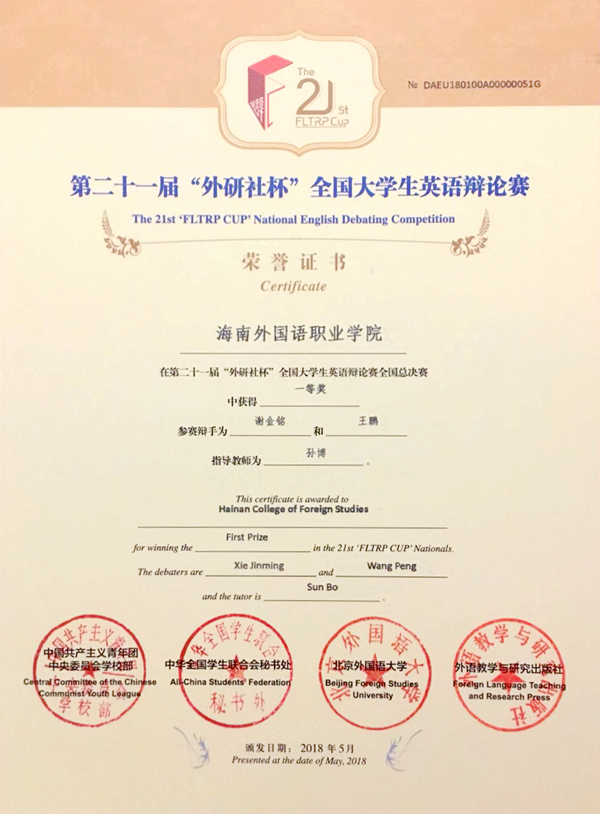 5月21日,由团中央、全国学联秘书处、北京外国语大学主办,外语教学与研究出版社承办的第21届“外研社杯”全国大学生英语辩论赛全国总决赛在北京外国语大学落幕,从华东、华西、华南、华北四大赛区500所院校中胜出的112支大学代表队同台竞技,进行了为期六天的激烈角逐。由英语系谢金铭、王鹏两位同学组成的我院代表队表现优异、脱颖而出,斩获全国总决赛一等奖,开创了我省高校参赛历史的最好成绩,同时也是全国高职院校参赛史上的最好成绩。