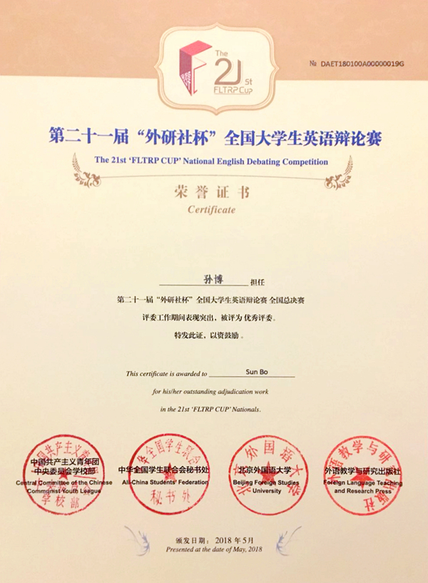 据悉,我院代表队以华南赛区一等奖的身份晋级全国总决赛,是112所晋级全国总决赛唯一的一所高职院校。在总决赛中,谢金铭、王鹏两位辩手与中国人民大学、复旦大学、北京外国语大学、上海外国语大学、四川大学等高校的辩手面对面竞逐,他们沉稳发挥、沉着应战,凭借清晰的逻辑思维、流利的语言表达、快速的临场反应和渊博的学识积累稳步提升名次,最终斩获一等奖。英语系孙博老师同时荣获“优秀指导教师”和“优秀评委”。