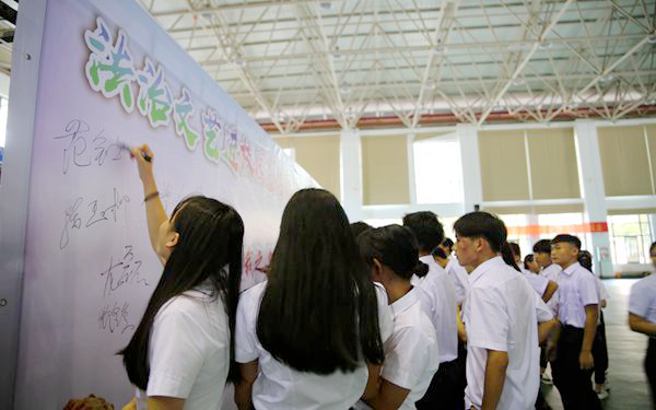 观看演出之前,2018级新生们在签名墙上签上了他们创设平安校园、和谐校园的决心。