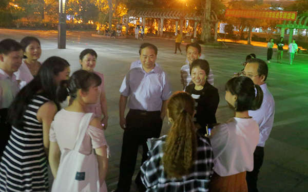 遇上下晚自习的学生,来访一行还与他们攀谈、交流。交谈中,王定华书记用英语询问了同学们学习生活的情况,鼓励同学们好好学习、全面发展,将来做对国家、对社会有用的人。