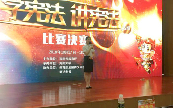 讲宪法”演讲比赛决赛在海南大学举办,经过前期初赛的选拔,全省高校评选出的16名选手参加最后的决赛。我院英语系17翻译(2)班林菲同学在决赛中表现出色,最终获得高校组二等奖的好成绩。