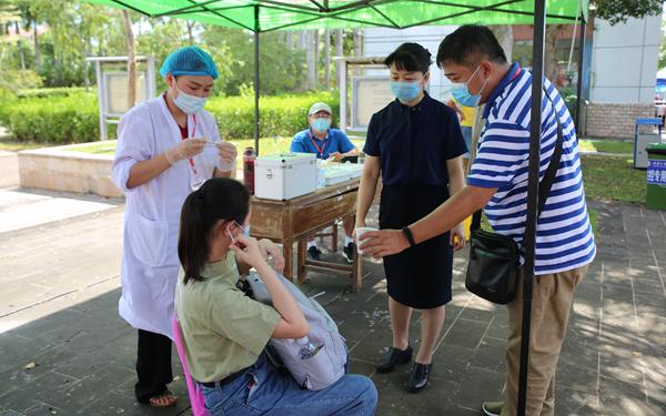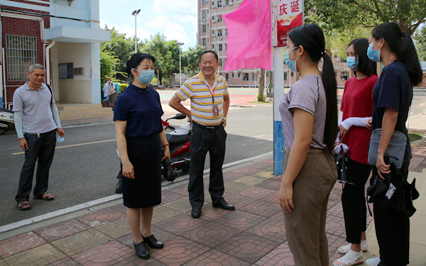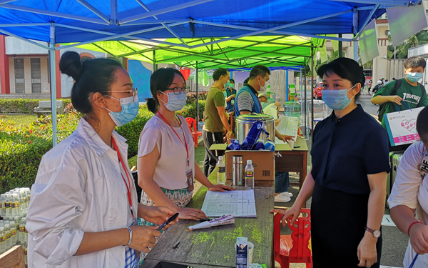 看到临时留观处有一位同学因为天气太热在进入校园测温时体温偏高流露出担忧的神情,李院长主动上前询问,安慰学生,让她放松心情喝点水,在校医指导下休息段时间再测体温。