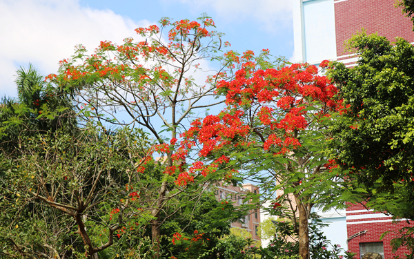 5月16日是我院新学期学生返校第二天。清晨,阳光洒遍海外院的每个角落!热情如火的凤凰花迎着朝阳绚丽绽放……