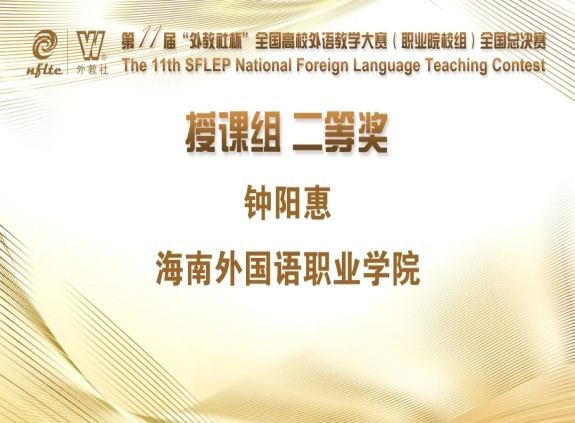 4月8日至9日,第十一届“外教社杯”全国高校外语教学大赛(职业院校组)全国总决赛隆重举办,我院选手钟阳惠老师代表海南省参加总决赛。钟阳惠老师以扎实的语言功底、从容的教态、清晰的教学思路、灵活多样的教学方法、课程思政元素的有效融合等“征服”了大赛评委,最终获得授课组的二等奖。