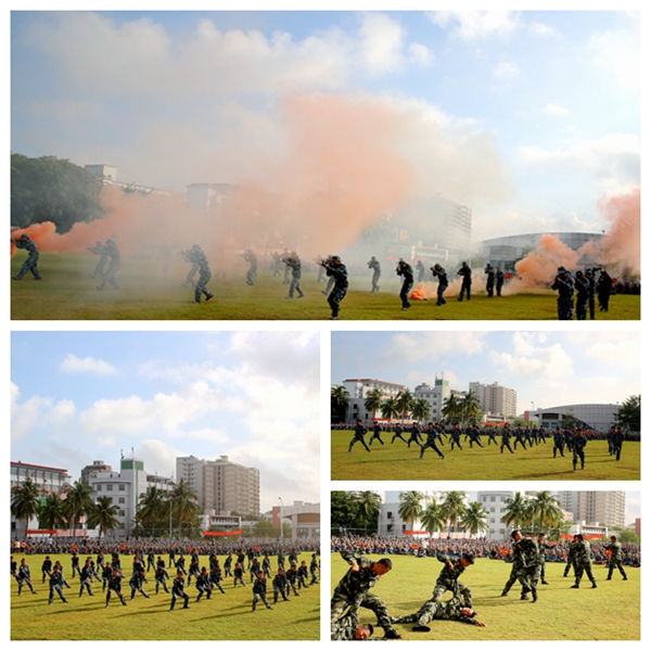 教官和新生带来的军体拳表演训练有素,血气方刚,一招一式干净利落;匕首操方阵女生们英姿飒爽,手握刀柄,拳峰向上,动作规范,整齐划一,引来掌声不断。2021级新生们充分展示了“小萌新”们的“大力量”,展现了我院学子奋发向上的精神风貌和青春风采。