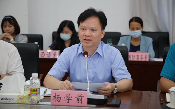 杨学前对省侨联到学院调研表示热烈欢迎,对省侨联给予的工作指导和支持帮助表示衷心感谢,并介绍了学院发展规划、外语专业建设、国际师资队伍建设、国际合作与交流及侨联工作等方面情况。他希望省侨联加强对我院留学归国人员工作的指导,充分发挥省侨联的平台优势,为师生出国学习交流、留学归国人才引进、海外华人华侨子弟学习汉语和海南本土文化提供支持与帮助,为海南自由贸易港建设作出更大贡献。