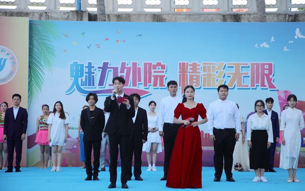 现场气氛十分活跃。有草原的绿浪,欢快而奔放;滂然沛然的战歌,绘制了一幅气度恢弘的图画;壮烈的号角声,使我们铭记历史;有伴着海南自由贸易港激昂的鼓点,新时代的海南正在争创中国特色社会主义实践范例,谱写美丽海南新篇章;更有人文艺术系党总支副书记林鹏演讲的《相信未来》,让我们相信自己,相信未来,相信我们的未来不是梦。节目最后是由杨诺析 (英)、王菁(泰)、郑启清(法)、杨倩(柬埔寨)、陈海俊(西班牙)、郭俐莹(马来西亚)、王安样(俄)等学生用多种外语会同学院舞蹈团一起带来的歌舞《我和我的祖国》,以外语为翅膀,用深情抒发勇于担当、团结奋进的爱党爱国之情,向伟大祖国告白!