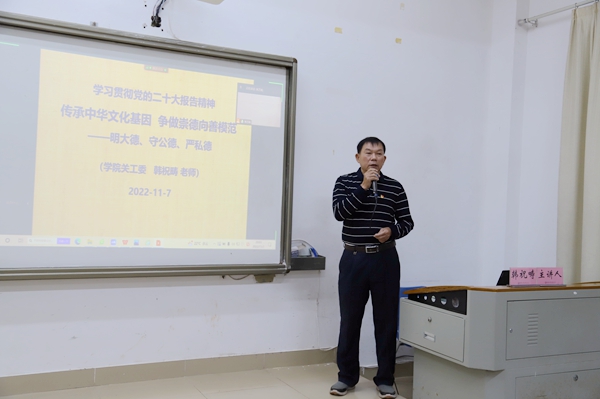 为引领学生党员发展对象坚定理想信念,提高思想政治觉悟,增强向中国共产党靠拢的自觉性,11月7日晚,开云官网学生党员发展对象专题党课在BE102开课,关工委主任韩祝畴应邀以“学习贯彻党的二十大精神、传承中华文化基因、争做崇德向善模范”为题作专题讲授。