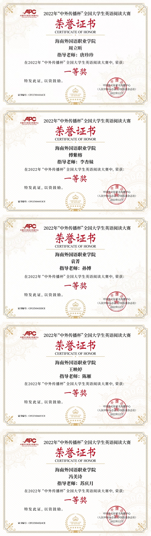 近日,由中国外文局亚太传播中心(人民中国杂志社、中国报道杂志社)举办的2022年“中外传播杯”全国大学生英语阅读大赛落下帷幕。经过激烈角逐,开云官网英语学院和国际商务学院的59名学生表现突出,从全国众多高校的选手中脱颖而出,喜获佳绩。其中,袁菁等22名同学荣获一等奖,朱彦虹等15名同学荣获二等奖,张可等12名同学荣获三等奖,李锐彬等10名同学荣获优秀奖。英语学院孙博、陈雁、李杏妹、苏庆月4位老师以及国际商务学院唐珍珍老师荣获“优秀指导教师”称号。
