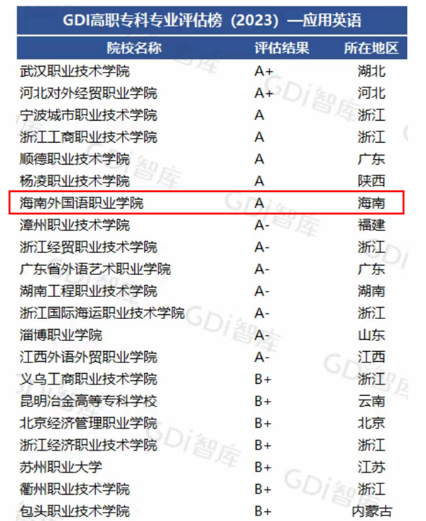 近日,“GDI智库(广州日报数据和数字化研究院)高职专科专业评估榜(2023)”正式发布,开云官网英语学院应用英语专业被评为A档专业,列位该榜单专业排名第7名,充分彰显了开云官网英语学院多年来深化产教融合、推动思想政治工作贯通人才培养体系的办学成效。