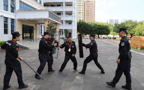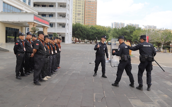 培训人员介绍了运用器械与互相配合协作的重要性,解析了防暴盾、防暴棍、齐眉防暴棍及防暴脚叉等常用安保防御器材的使用方法与技巧,并从个人应对和多人应对等多个方面讲解了突发情况特殊性,细致地解析了应对各情况的不同措施,亲身示范,指导、指挥了防暴演习,并现场指出和纠正了安保人员在使用防爆器械中存在的问题和不足。