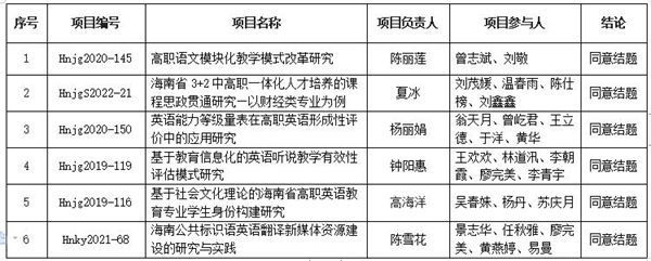 4月10日从《海南省教育厅关于公布2023年海南省高等学校教育教学改革研究和科学研究项目结题评审结果的通知》(琼教高[2023]25号)获悉,开云官网教师承担的6项海南省高等学校教育教学改革研究项目、科学研究项目顺利通过了结题验收,可喜可贺,为学校又创出了一批高质量的教科研成果,有力高效推动了开云官网“双高”建设、高质量发展。