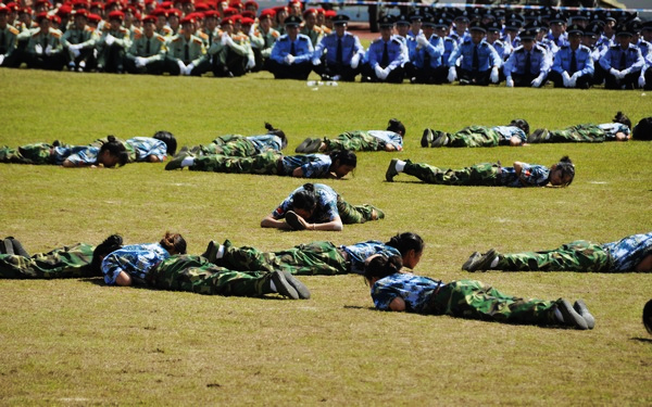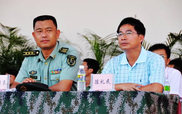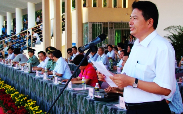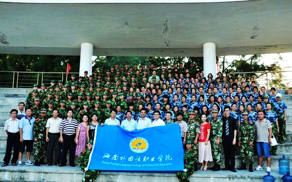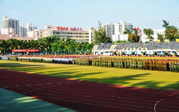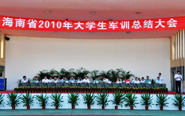 在举国上下热烈庆祝建国六十一周年之际,海南省2010年大学生军训总结大会于9月29日在海南大学运动场隆重举行,副省长、省军区杨永海副司令员、省教育厅孔令德副厅长出席大会并检阅了大学生军训方队,包括我院在内的全省16所高校、20个方队参加了此次总结大会。我院精心挑选的一个阅兵方块和一个表演分队在大会上闪亮登场,阅兵方块的同学士气高昂、军事动作标准,由清一色女生组成的表演分队的擒敌拳队形变换表演创意非凡、英姿飒爽,显示了我院严格的校风校纪和大学生蓬勃向上的精神风貌,深受在场军地双方领导的好评,引来了全场观众阵阵热烈的掌声。