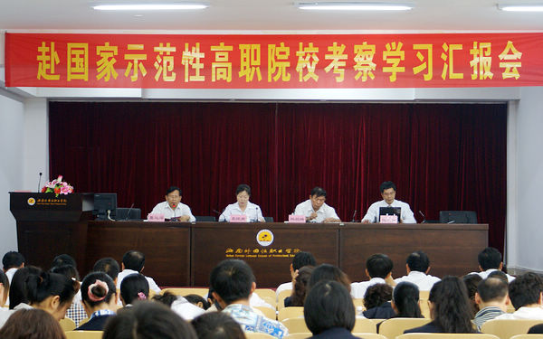 会上,考察组成员结合考察学习的体会和思考,运用大量的考察图片、文字资料和统计数据,详细分析了此次访问的这两所高职院校在专业建设、课程建设、实训建设、人才培养模式创新以及校企合作实践等方面取得的成绩、经验和对我院发展的启示。