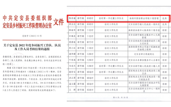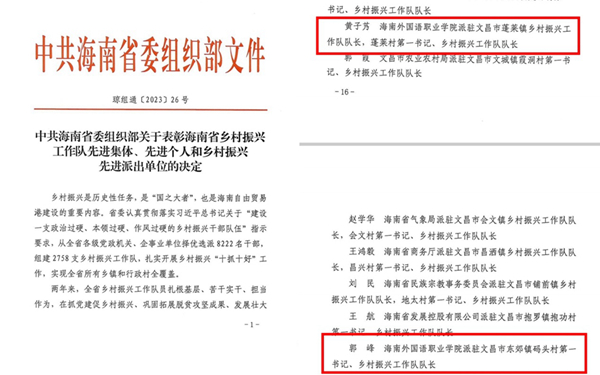 日前,省委组织部等单位表彰海南省乡村振兴工作对先进集体、先进个人和乡村振兴先进派出单位。开云官网西方语言学院党总支书记、派驻文昌市蓬莱镇乡村振兴工作队队长、蓬莱村第一书记、乡村振兴工作队队长黄子艿,西方语言学院俄语专业教师、派驻文昌市东郊镇码头村第一书记、乡村振兴工作队队长郭峰在驻村工作期间连续两年获得文昌市乡村振兴“先进个人”荣誉称号,今年获得海南省乡村振兴“先进个人”荣誉称号;国际旅游学院辅导员、派驻定安县新竹镇祖坡村第一书记、乡村振兴工作队队长陈奕埔获得定安县乡村振兴“先进个人”荣誉称号。